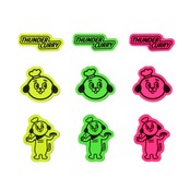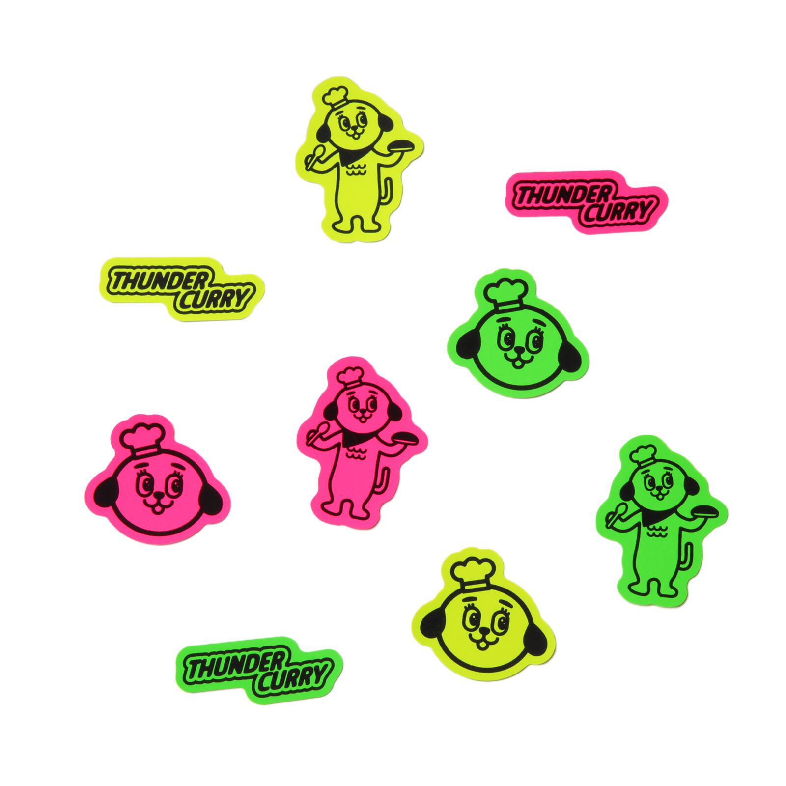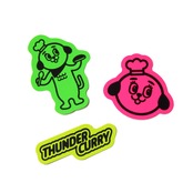 THUNDER CURRYロゴ・サンダー君顔・サンダー君全身の3枚1組セットの蛍光シルクスクリーンステッカー。